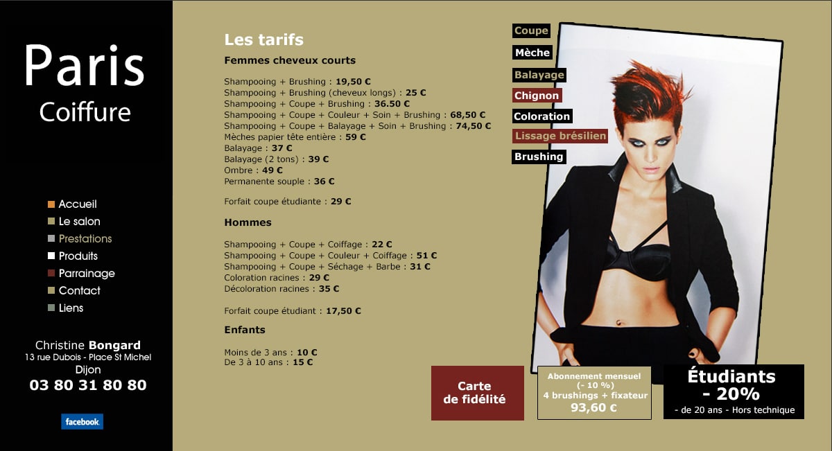 SALON COIFFURE MIXTE Hommes Femmes Enfants Dijon SALON COIFFURE MIXTE Hommes Femmes Enfants DIJON Prenez rendez-vous en ligne sur Prenez rendez-vous en ligne sur Ouverture du mardi au samedi Mardi 9 h – 12 h / 14 h – 18 h 30Mercredi9 h – 12 h / 14 h – 18 hJeudi 9 h – 18 hVendredi 9 h – 18 hSamedi 9 h – 16 h Nos produits Nos prestations Nos prestations